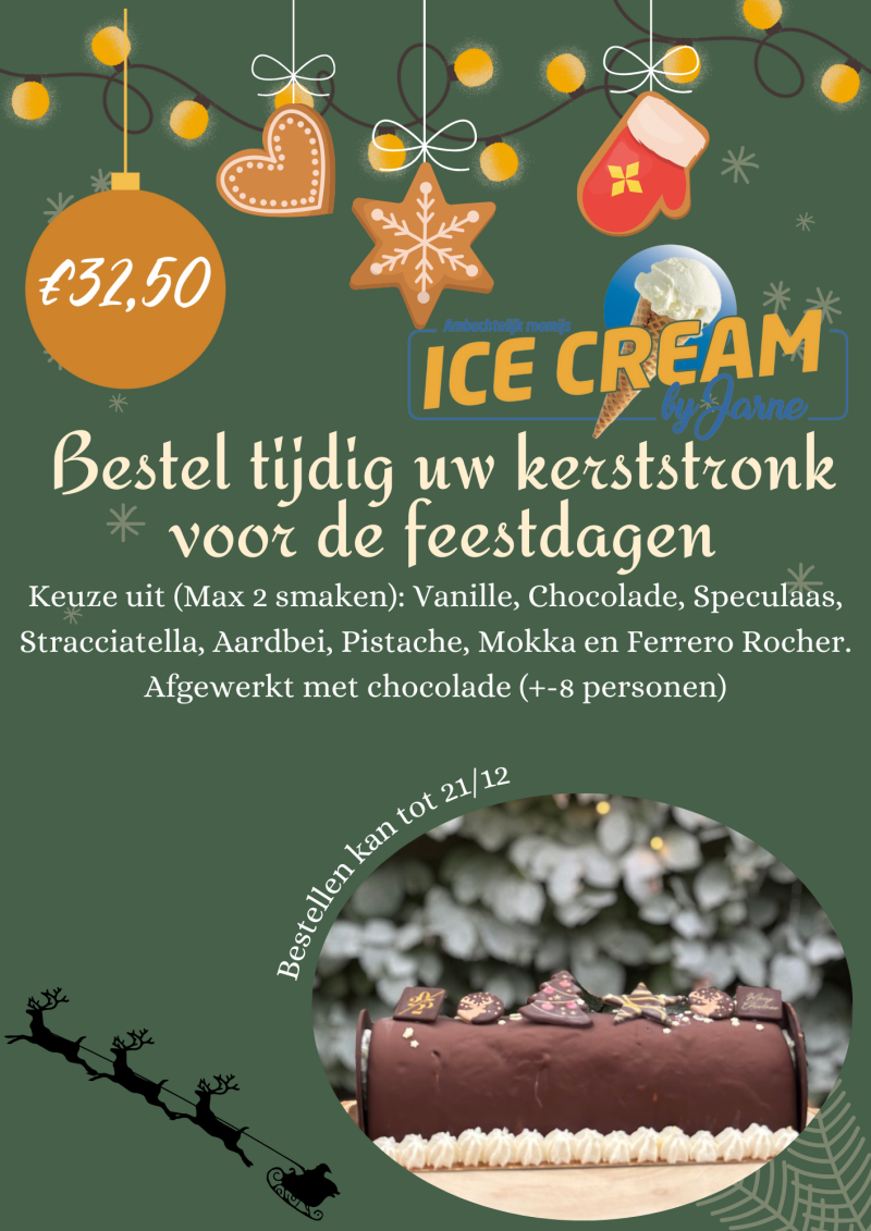 U kan kiezen uit verschillende smaken: Vanille, Chocolade, Speculoos, Stracciatella, Aardbei, Pistache, Mokka en Ferrero Rocher. Onze ijsstronken worden steeds afgewerkt met chocolade. Één stronk is voor +-8 personen